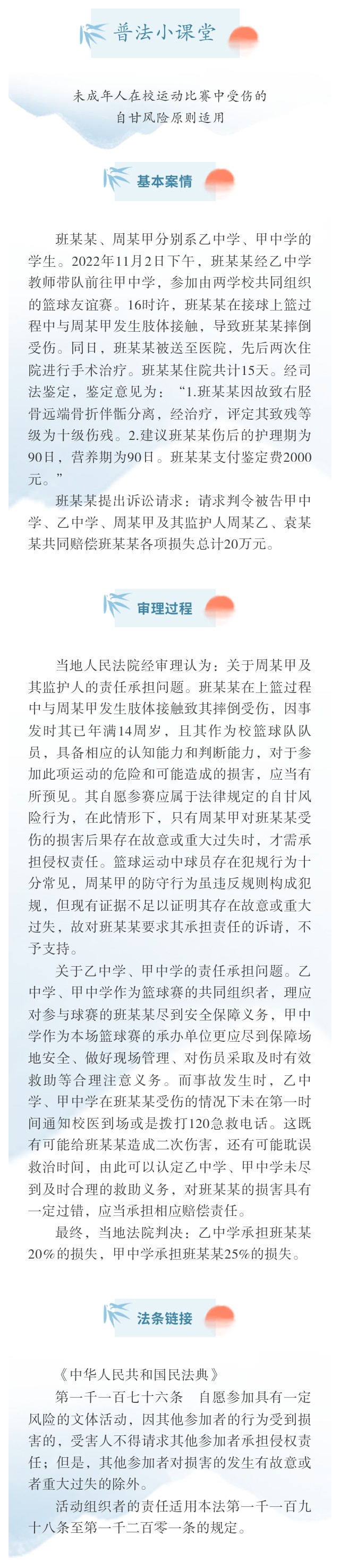 普法小课堂|未成年人在校运动比赛中受伤的自甘风险原则适用
